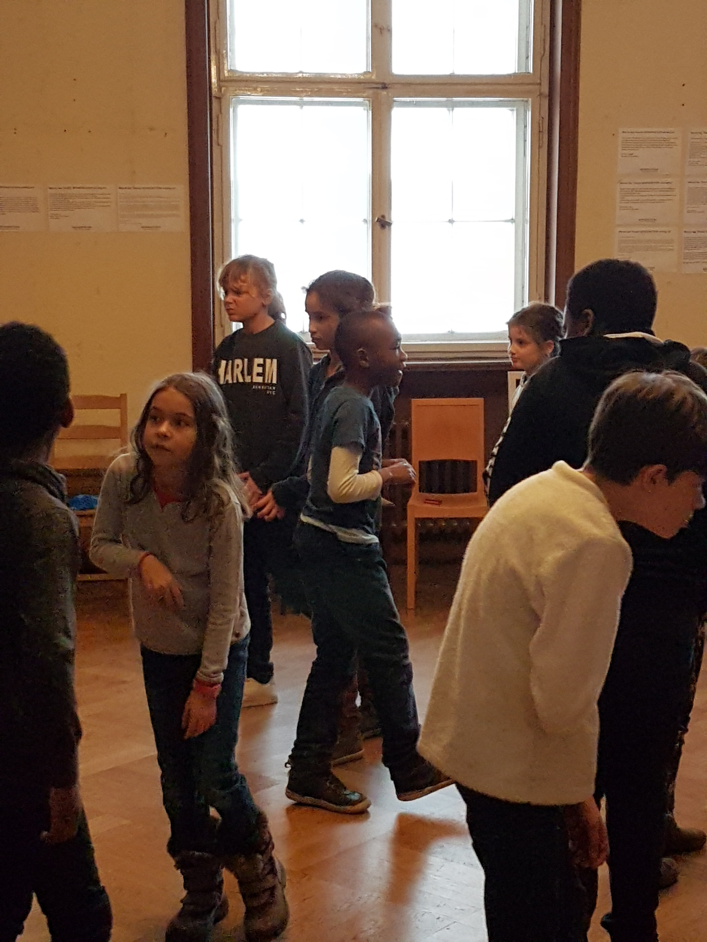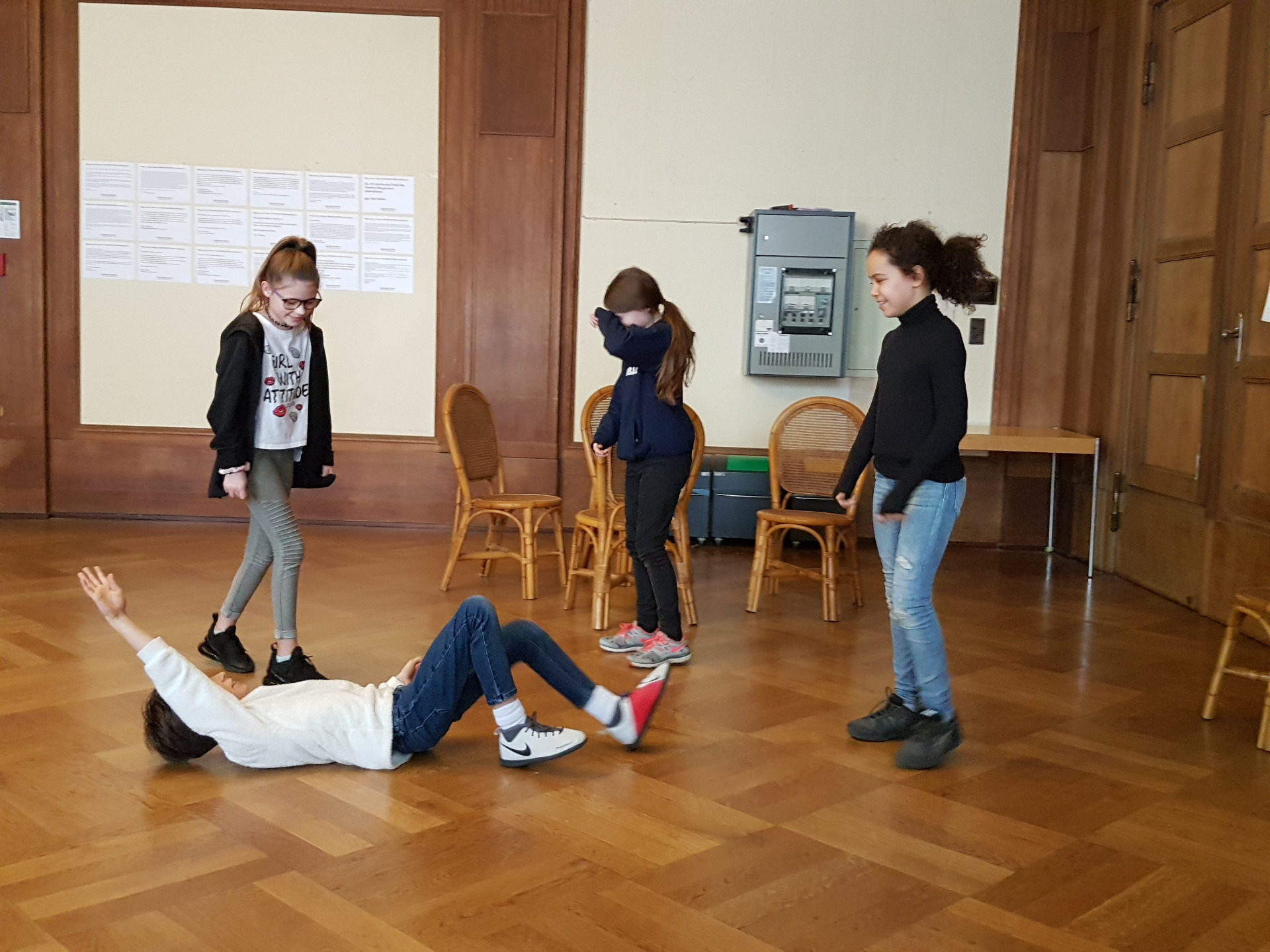 Bevor es in Gruppen mit der Erarbeitung einer eigenen kleinen Fabel losging, wurden einige Übungen zum Aufwärmen durchgeführt.